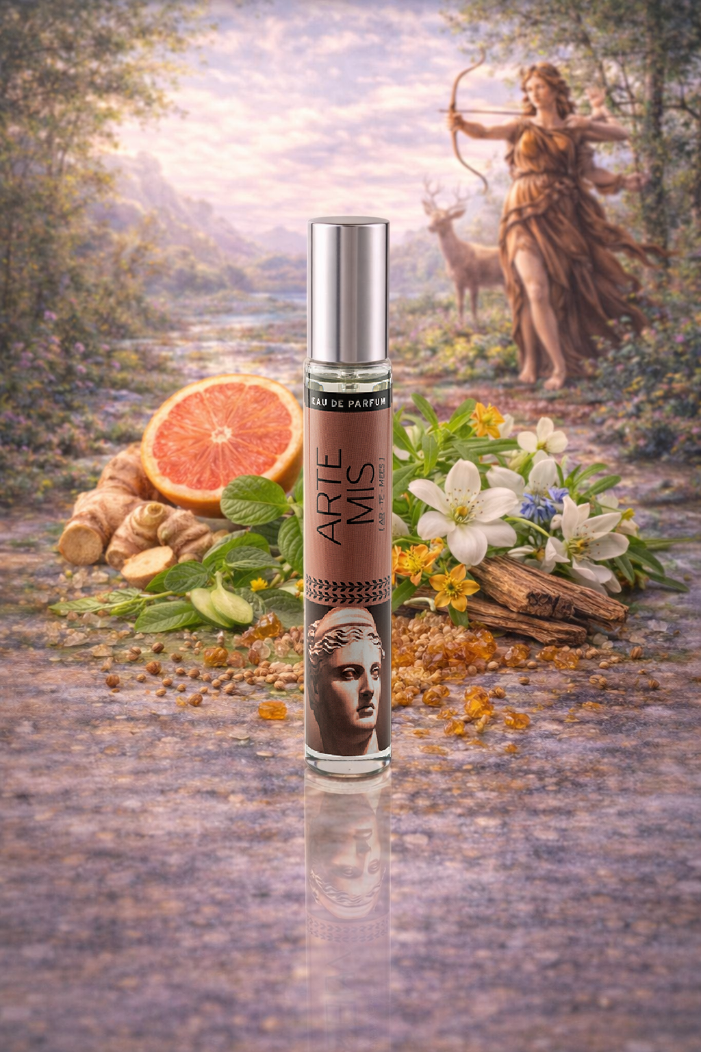 Artemis to kobieca woda perfumowana inspirowana imieniem mitycznej bogini łowów, symbolizującej siłę charakteru, wolność ducha i harmonię z naturą. Ta wyjątkowa kompozycja łączy świeże, energetyczne nuty z ziołowymi i kwiatowymi akordami, tworząc zapach, który pobudza zmysły i dodaje pewności siebie.