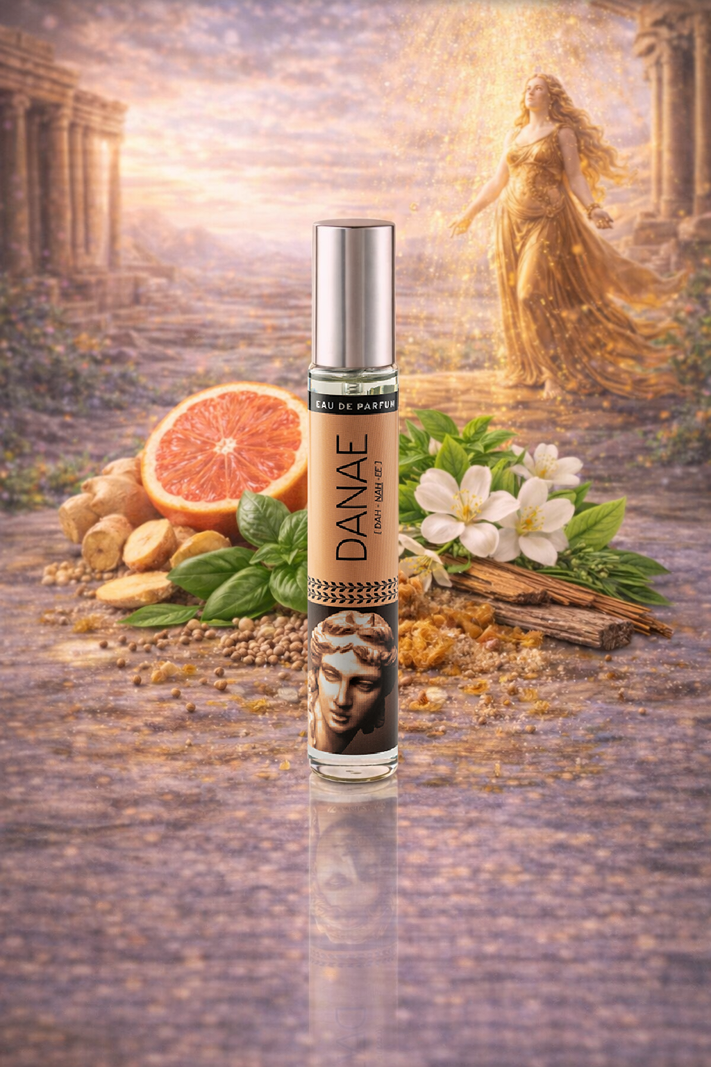 Danae to kobieca woda perfumowana inspirowana postacią Danae z mitologii greckiej – symbolizującą piękno, przeznaczenie i subtelną siłę kobiecości. Ta kompozycja łączy w sobie świeżość cytrusów, delikatne akordy kwiatowe i ciepłą, harmonijną bazę, tworząc zapach, który budzi optymizm, subtelną elegancję i naturalną aurę.