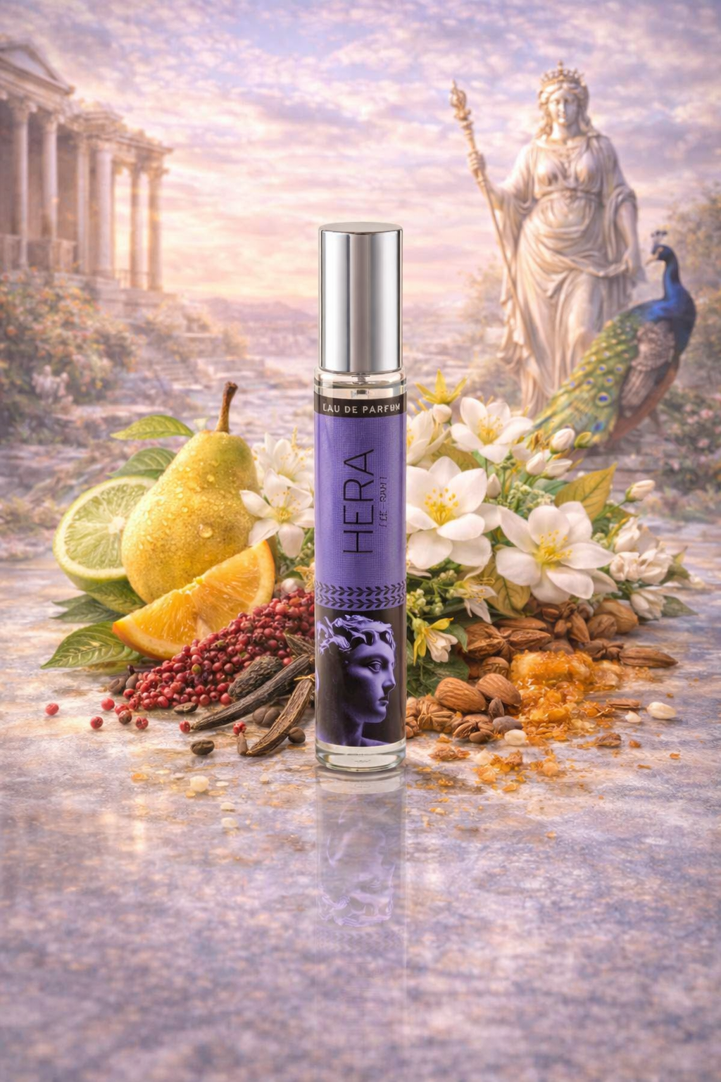 Hera to luksusowa woda perfumowana dla kobiet inspirowana imieniem najwyższej bogini Olimpu, symbolizującej siłę, elegancję i niezłomną godność. Ta wyjątkowa kompozycja łączy w sobie aromatyczne, kwiatowe i drzewne nuty, tworząc zapach, który otula zmysły i podkreśla kobiecą charyzmę przy każdym użyciu.